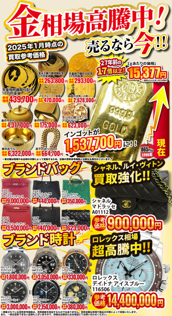 キャンペーン実施店舗 よくあるご質問 買取価格は主にどんな要素から決まるのでしょうか? お品物の状態や付属品の有無、最新相場、流通量などによって買取価格を算出します。 どんなものを買い取ってもらえますか? 金・貴金属・ブランド品はもちろん、お値段がつくか迷われているものも是非お持ちください。 傷や汚れのあるアイテムでも買取可能ですか? 大歓迎です。未使用品などのお持ち込みは少なく、傷や汚れのあるアイテムをお持ちいただく方が半数以上です。状態の悪いお品物やカビなどがあってもお買取可能なケースもございます。 どんな情報があればすぐに査定額を教えてもらえますか? お品物の名前や種類、状態、またはブランド名、型番などの情報があると、概ねの査定額をお伝えできるかと思います。 店舗での査定時間はどのくらいですか? お品物の種類や個数にもよりますが、約5分から30分ほどの査定時間となるケースが多いです。事前にある程度の査定時間をお伝えいたしますので、ご安心ください。
